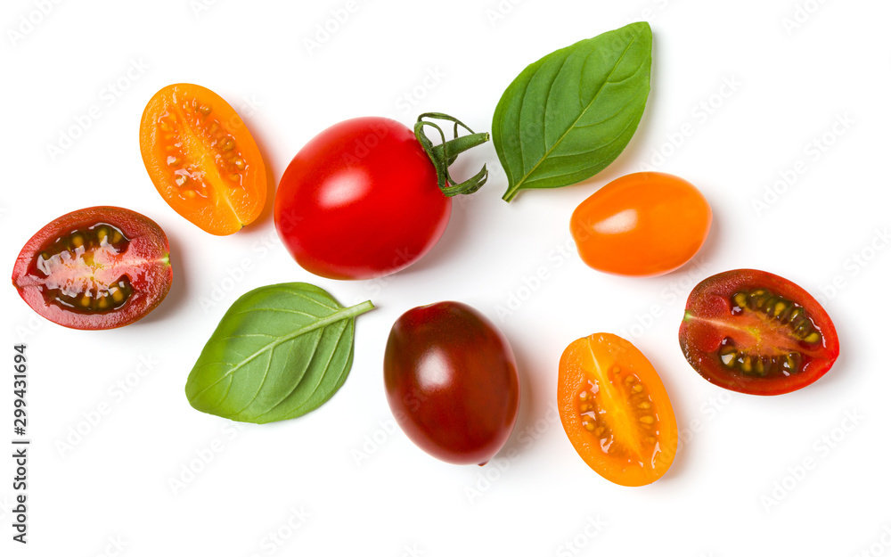various colorful tomatoes and basil leaves isolated on white background. Top view, flat lay. Creative layout.