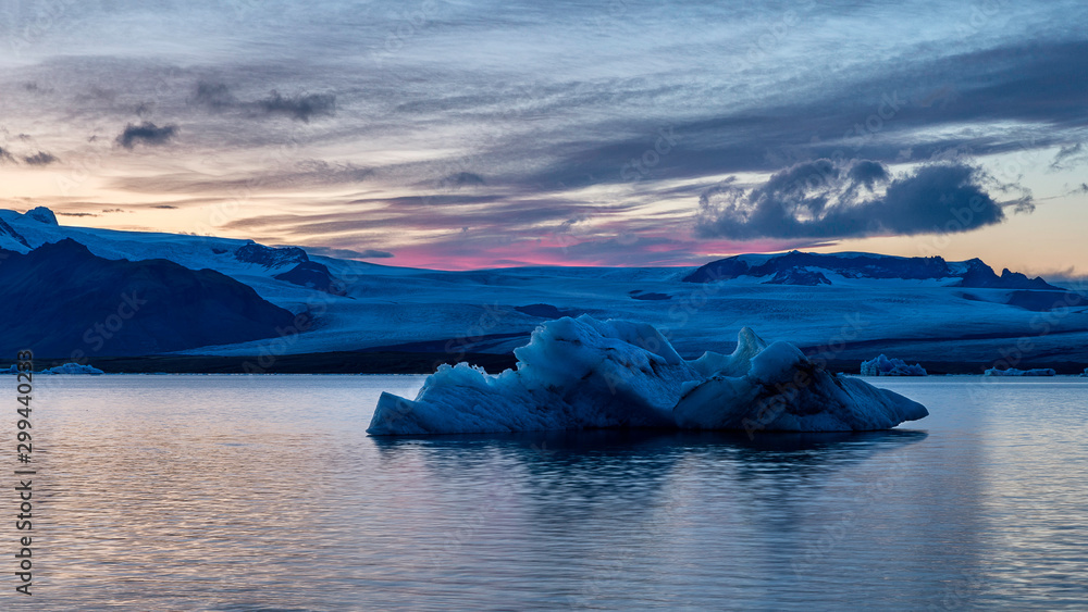 Jokulsarlon, glacier lagoon in Iceland at night with ice blocks floating in water.
