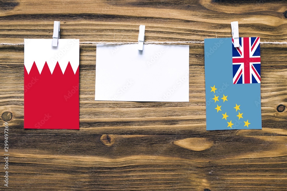 Hanging flags of Bahrain and Tuvalu attached to rope with clothes pins with copy space on white note paper on wooden background.Diplomatic relations between countries.