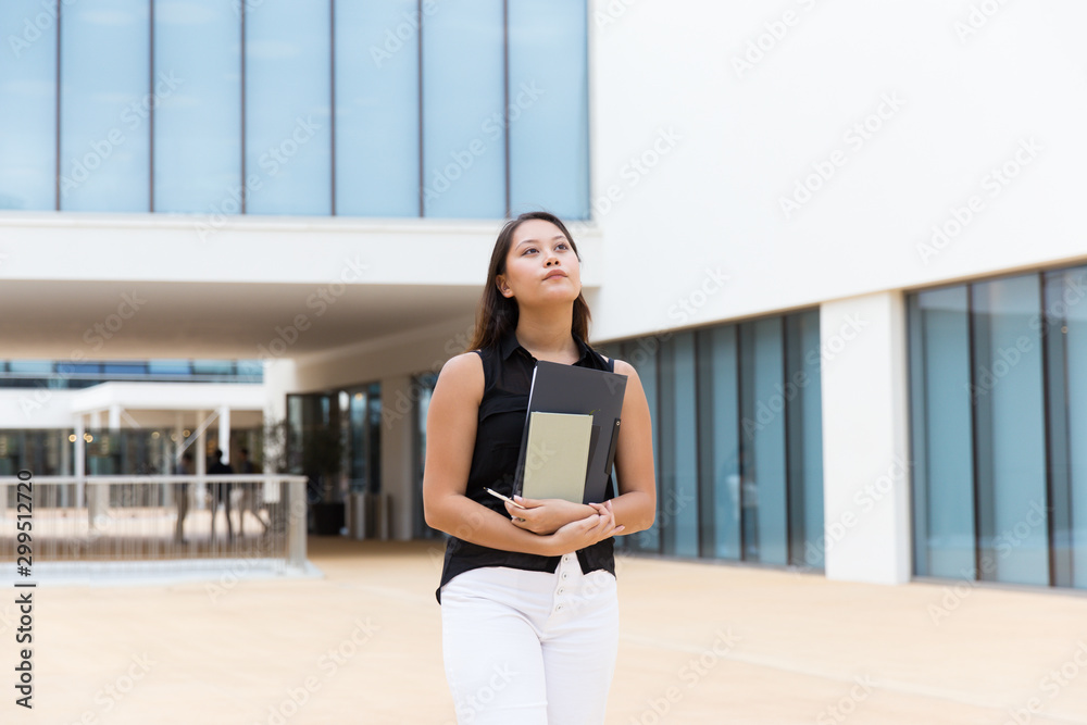 Pensive female student carrying documents. Young Asian woman walking outside, holding notebook and folder with papers. Walk in business center concept