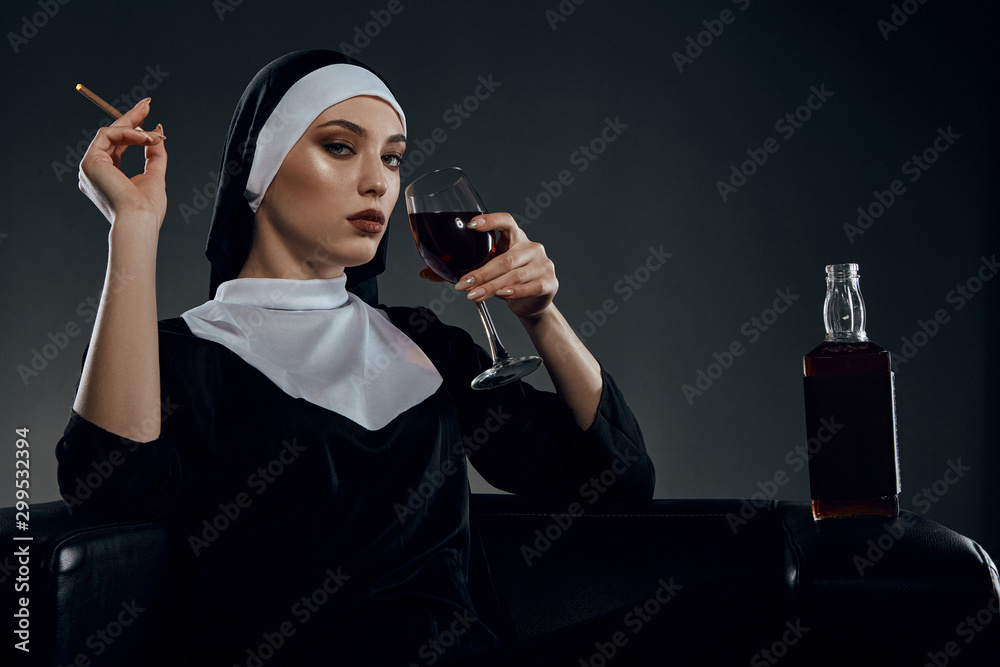 Cropped half-turn shot of a nun, sitting on a chair. She's wearing dark nun's clothing. The nun is drinking wine and holding cigarette in her hand. There is a bottle with alcohol on a chair armrest.