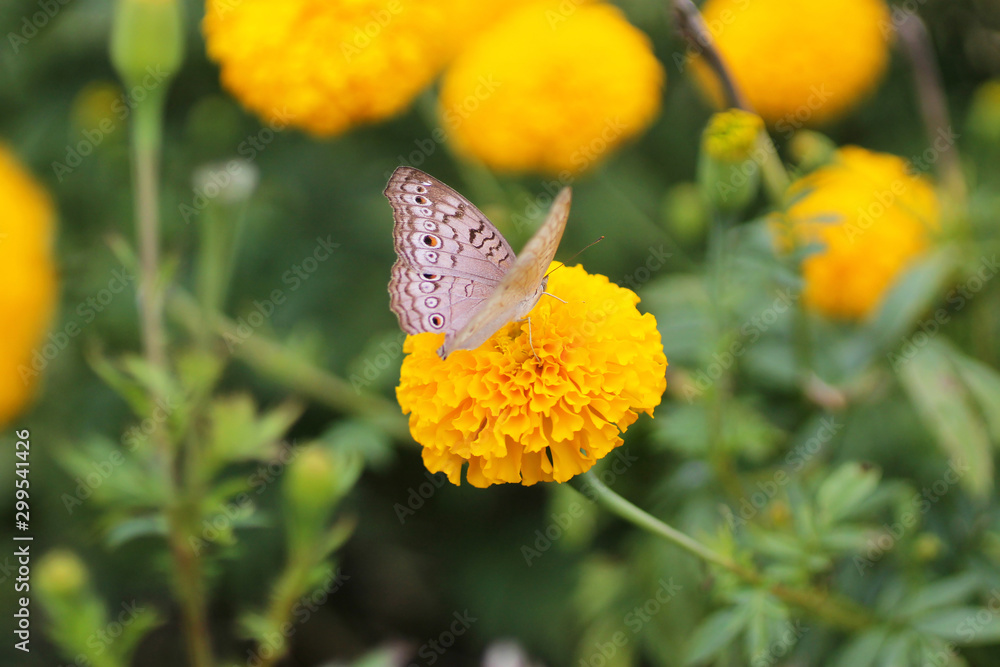 Butterfly on yellow marigold flower in fresh garden background.