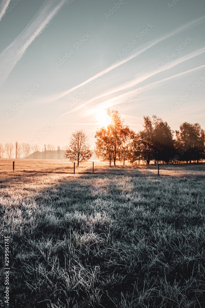 Calm and wonderful peaceful winter morning with frozen grass meadow and white nature and colorful ealry morning sunrise tones. Frosty white winter wonderland in the countryside with shadows