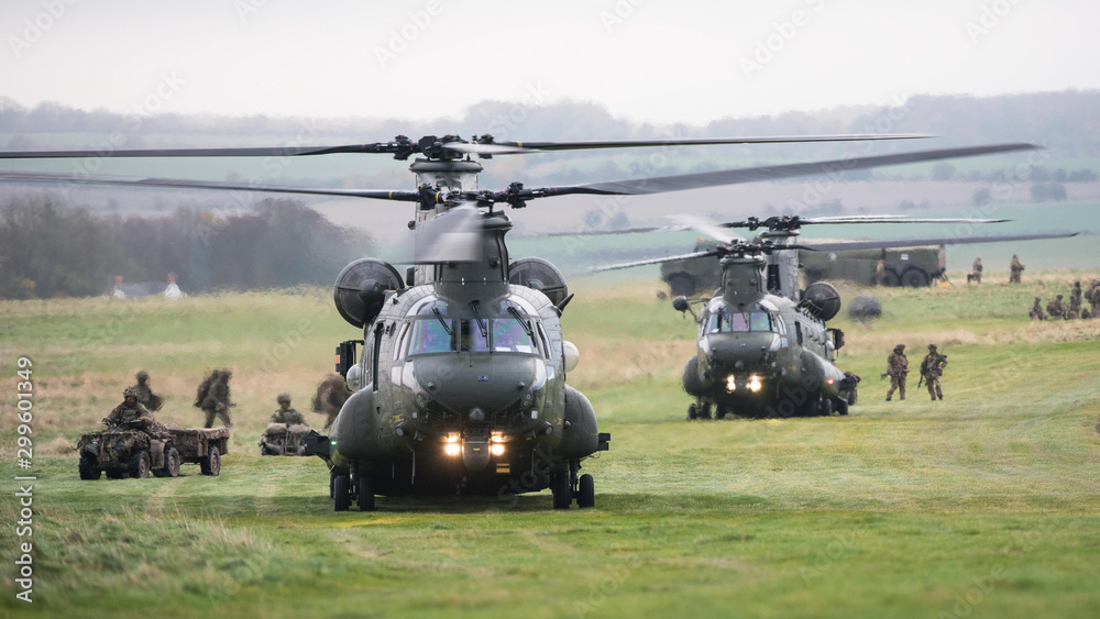Chinook helicopters are loaded during a military exercise on Salisbury Plain
