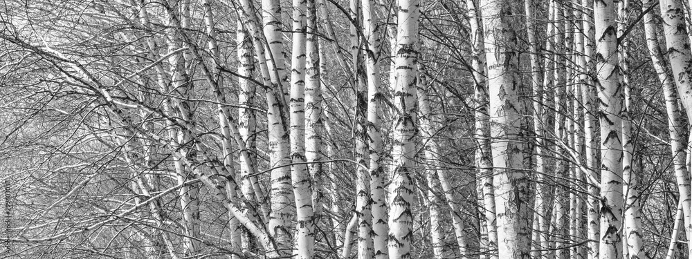 Birch grove on a spring day, landscape banner, huge panorama, black-and-white