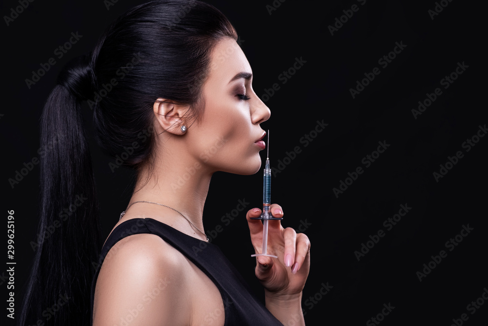 Cosmetology treatment on a brunette caucasian woman face. Fresh, clean skin with flawless features. She holds cosmetology items in her hands
