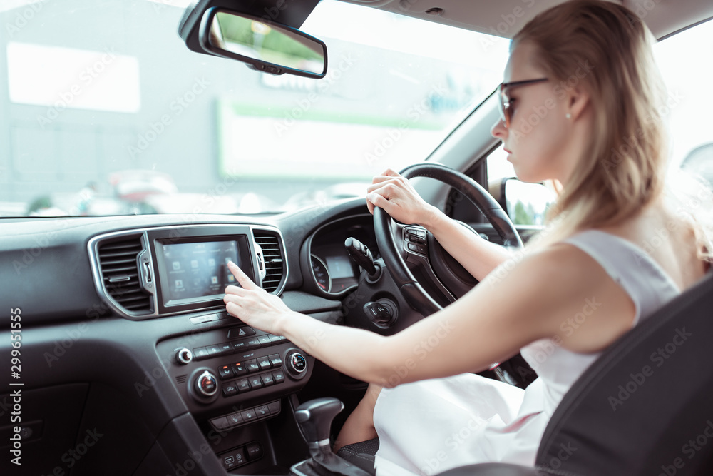 woman driving car, presses finger on touch screen, selects application on Internet, activates radio navigation and searches for route in the city. Background parking mall.