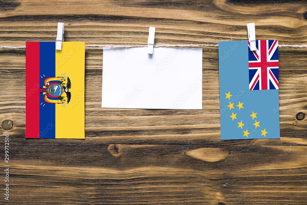 Hanging flags of Ecuador and Tuvalu attached to rope with clothes pins with copy space on white note paper on wooden background.Diplomatic relations between countries.