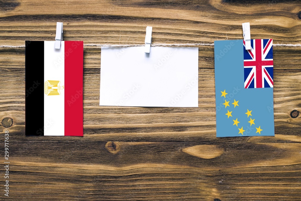 Hanging flags of Egypt and Tuvalu attached to rope with clothes pins with copy space on white note paper on wooden background.Diplomatic relations between countries.