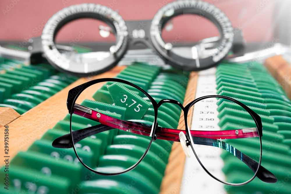 Opthalmology test box. The universal-messbrille tool of the optometrists and oculists. Set of dioptric glasses. Eyesight correction.