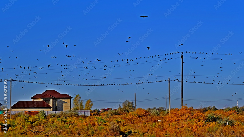 The pillar is electric. Electric wires. Power lines. Crows on wires