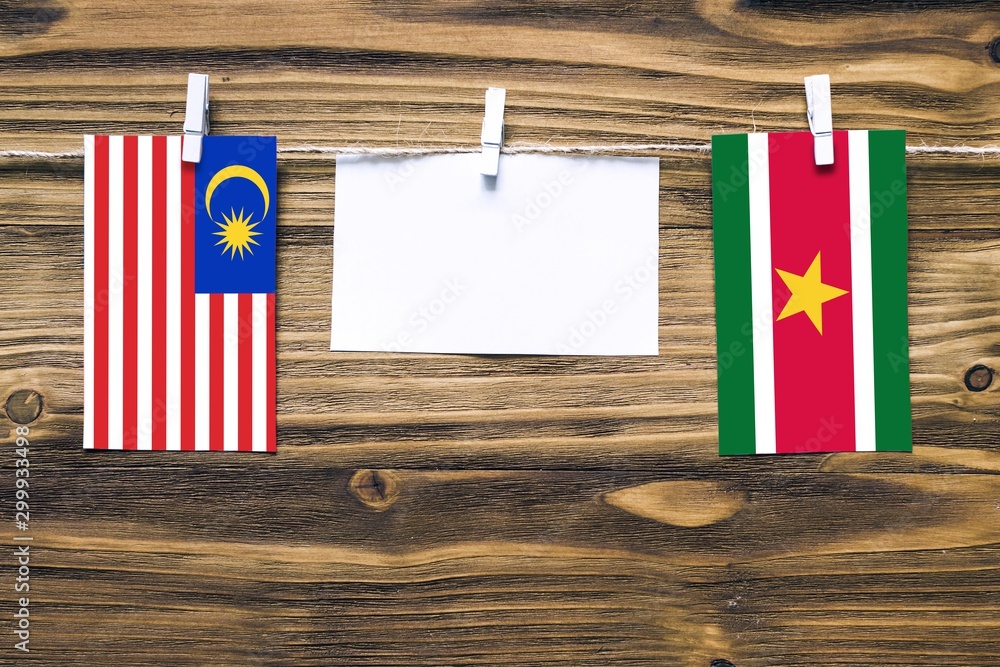 Hanging flags of Malaysia and Suriname attached to rope with clothes pins with copy space on white note paper on wooden background.Diplomatic relations between countries.