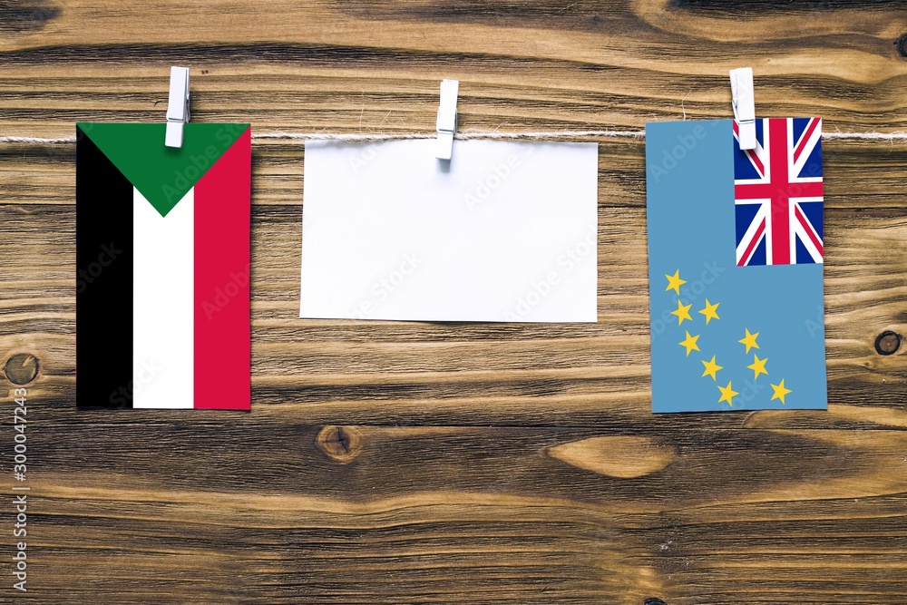 Hanging flags of Sudan and Tuvalu attached to rope with clothes pins with copy space on white note paper on wooden background.Diplomatic relations between countries.