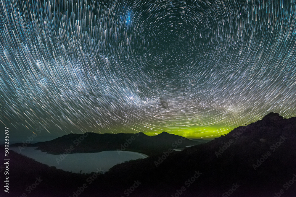 Aurora Australis and star trails over Wineglass Bay, Tasmania