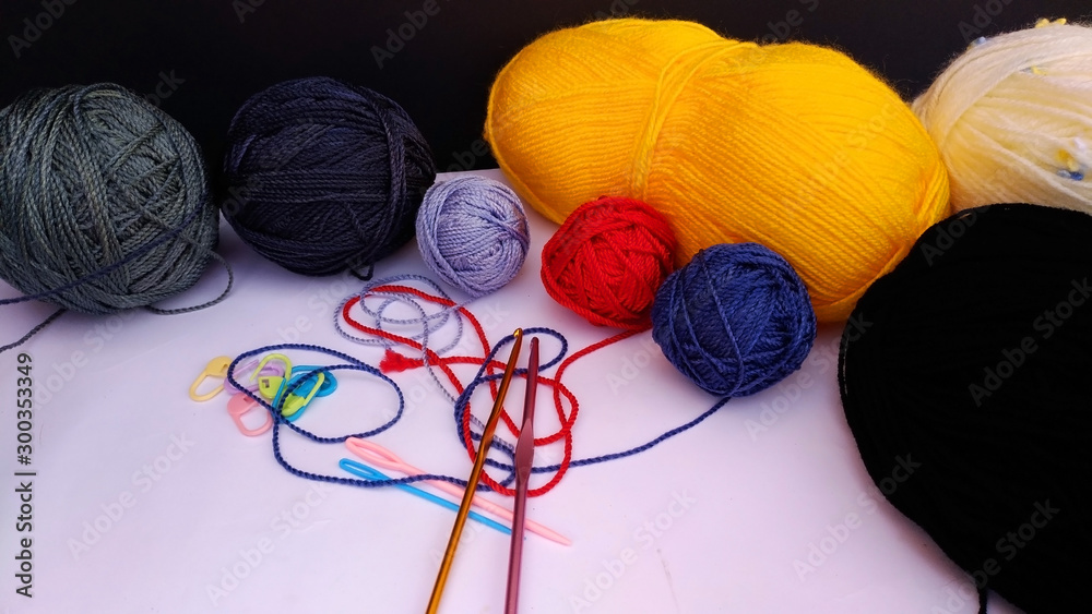 group of colorful yarn balls with crocheting accessories .close