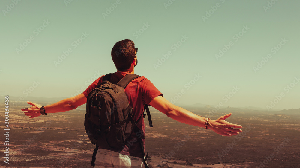 Hiker with backpack in the top of the mountain. Young man walking in the mountains during sunset. Mountains and people. Adventure and travel