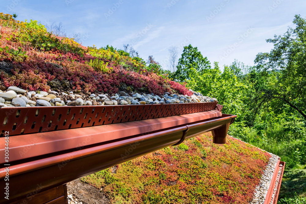Extensive green ecological living sod roof covered with vegetation mostly sedum sexangulare, also known as tasteless stonecrop