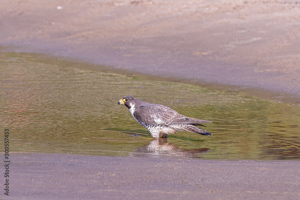 Face profile view of Peregrine falcon standing in a fresh water stream on a beach of Cape Kiwanda.