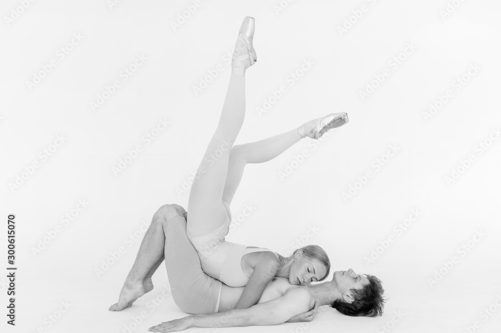 Two young classic ballet dancers practicing against white studio background