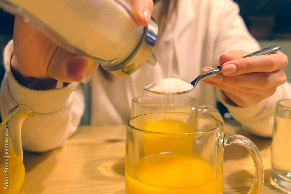 Woman puts sugar in sea buckthorn herbal tea preparing it. Hands closeup. Invigorating vitamin natural sea buckthorn berry juice with ginger and honey.