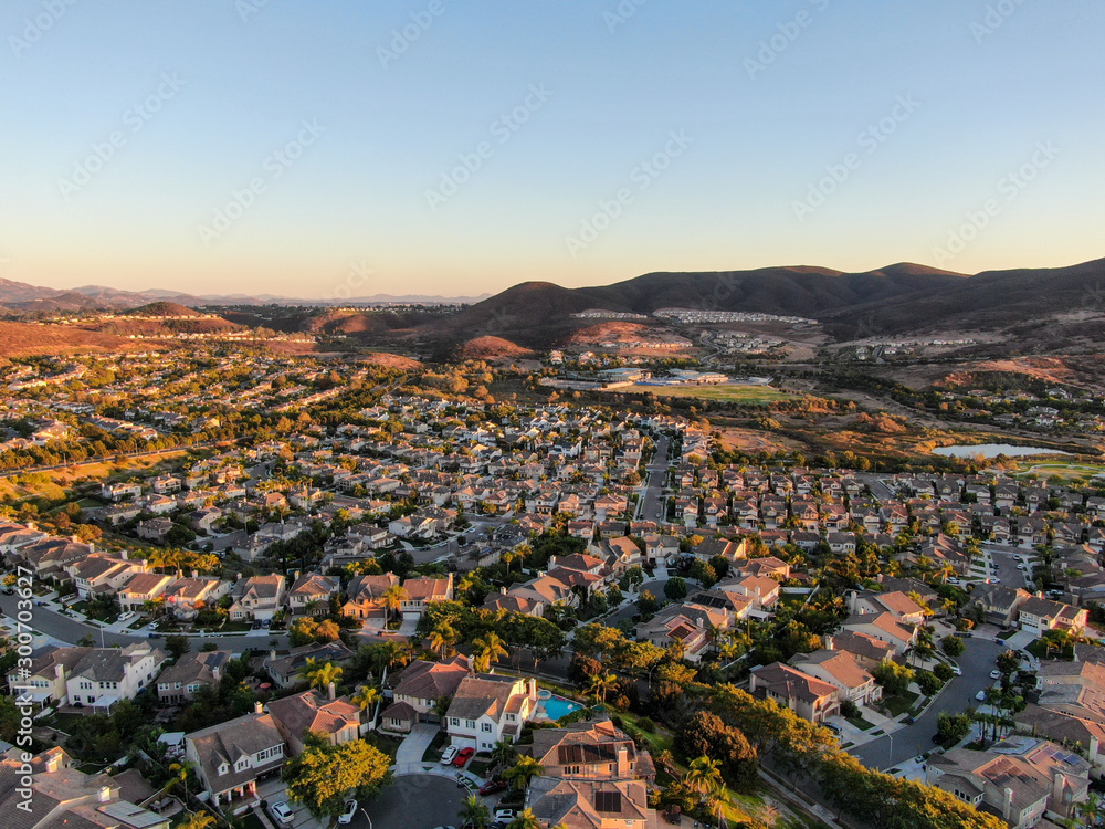 Aerial view of residential modern subdivision luxury house neighborhood during sunset. South California, USA