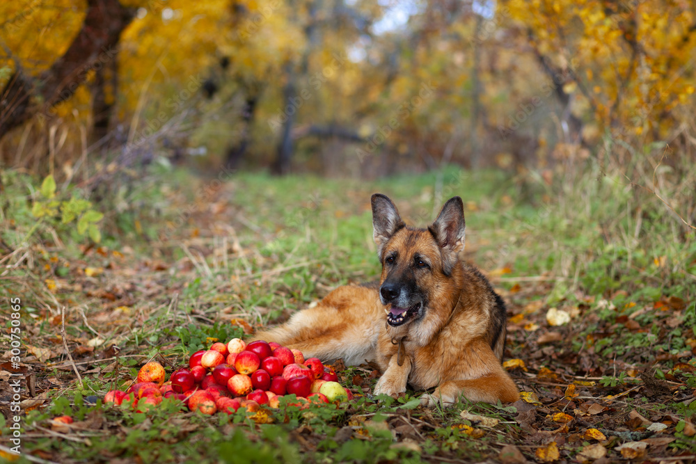 German shepherd dog lies in the autumn orchard next to a crop of red apples