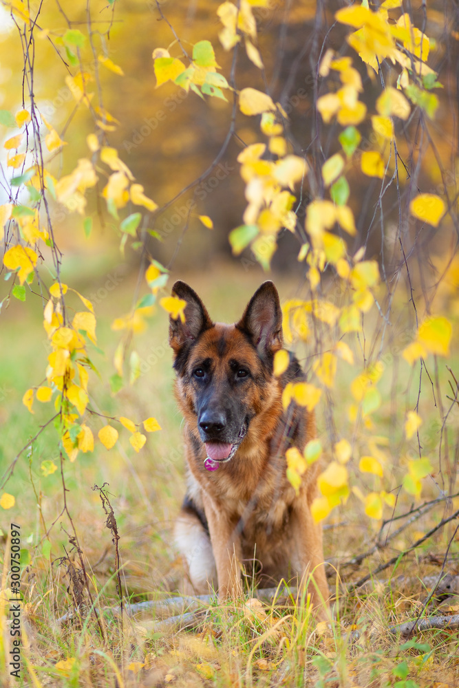German shepherd dog lies in the autumn orchard next to a crop of red apples
