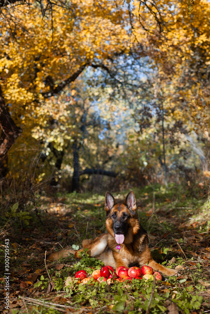 German shepherd dog lies in the autumn orchard next to a crop of red apples