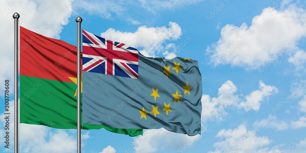 Burkina Faso and Tuvalu flag waving in the wind against white cloudy blue sky together. Diplomacy concept, international relations.