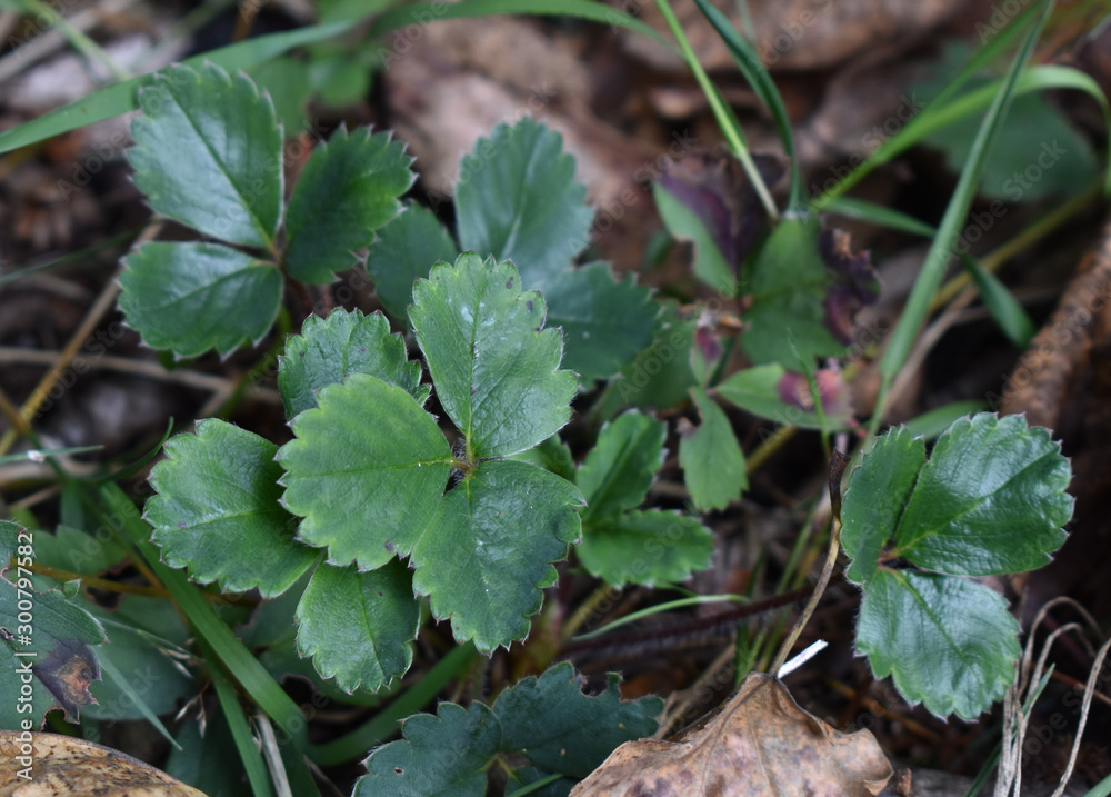 A small plant of Fragaria chiloensis, the wild strawberry, near Deception Falls in Washington state