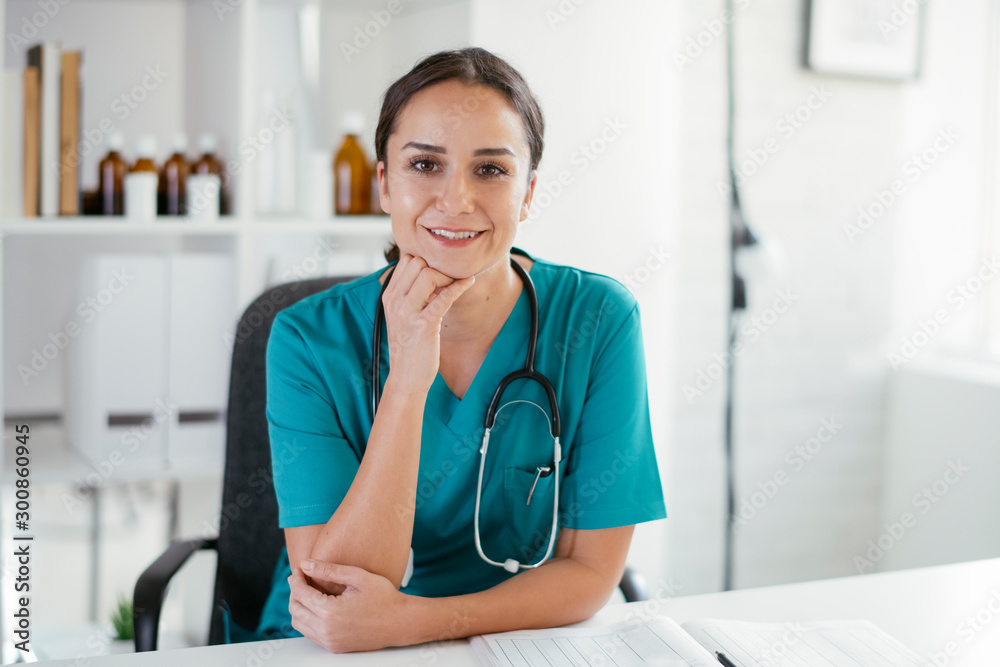 Young female doctor in medical office. Portrait of beautiful female doctor sitting in the clinic office.