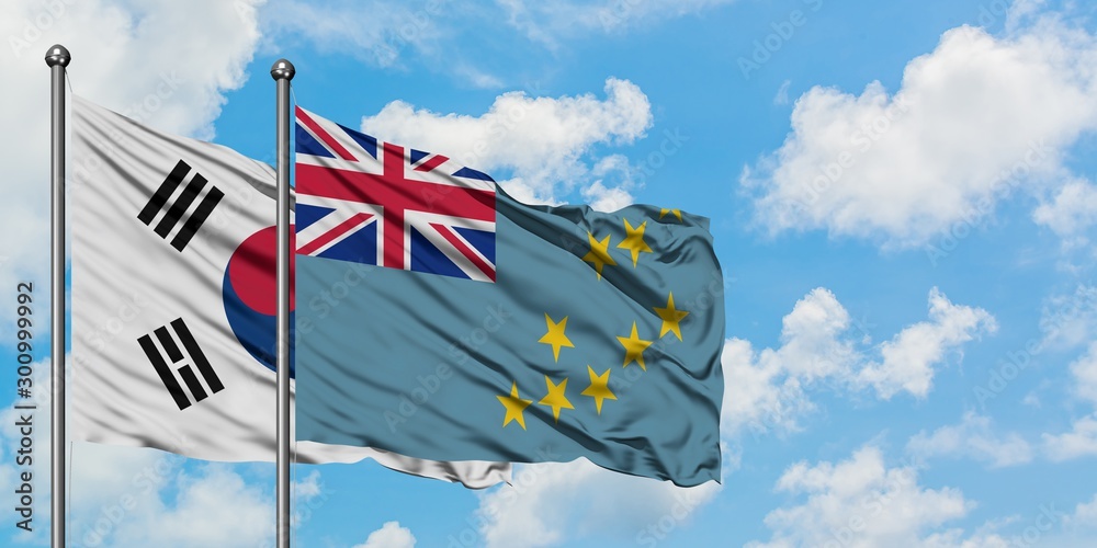 South Korea and Tuvalu flag waving in the wind against white cloudy blue sky together. Diplomacy concept, international relations.