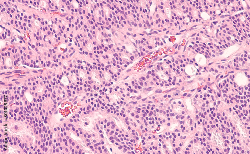Prostate Cancer Oncology Awareness: Photomicrograph of core biopsy of prostate gland showing histology of adenocarcinoma in patient with elevated PSA.