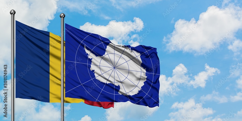 Romania and Antarctica flag waving in the wind against white cloudy blue sky together. Diplomacy concept, international relations.