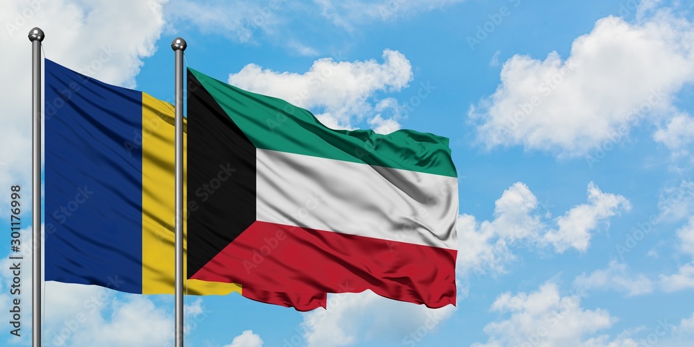 Romania and Kuwait flag waving in the wind against white cloudy blue sky together. Diplomacy concept, international relations.