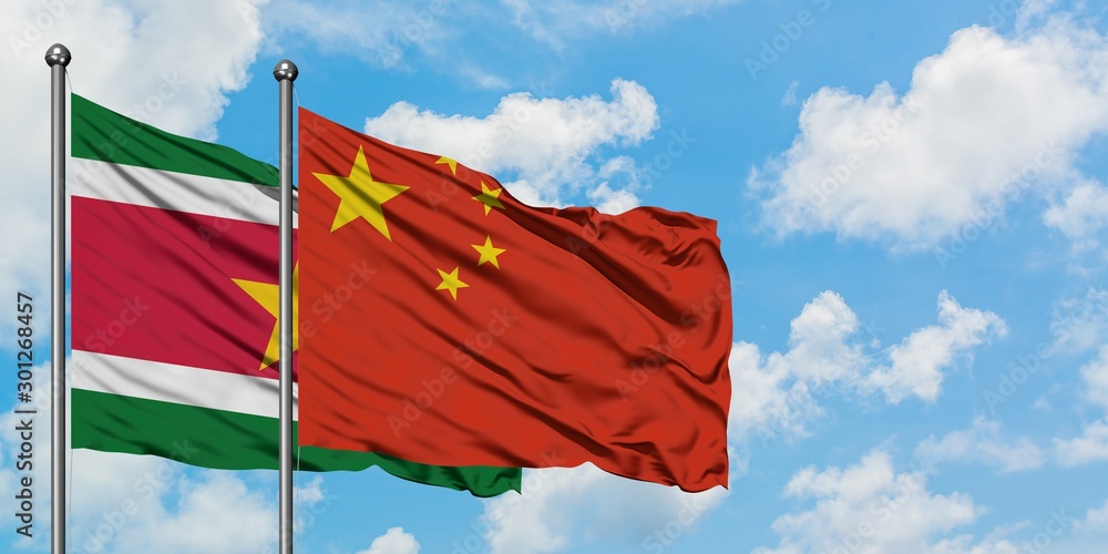 Suriname and China flag waving in the wind against white cloudy blue sky together. Diplomacy concept, international relations.