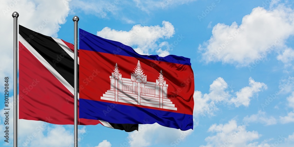 Trinidad And Tobago and Cambodia flag waving in the wind against white cloudy blue sky together. Diplomacy concept, international relations.