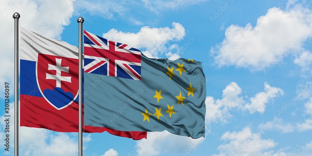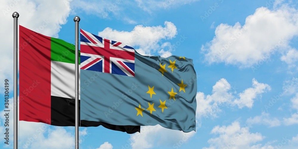 United Arab Emirates and Tuvalu flag waving in the wind against white cloudy blue sky together. Diplomacy concept, international relations.