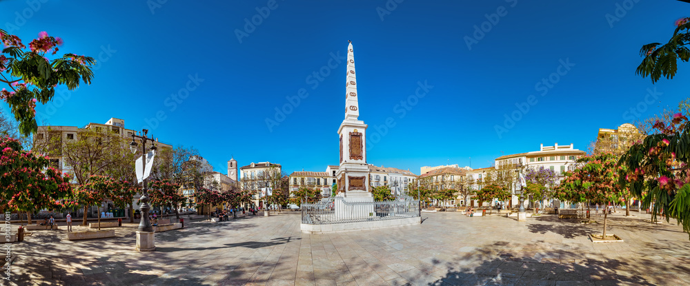 Panorama of the memorial obelisk dedicated to General Torrijos in Plaza de la Merced, popular square in the historic centre.