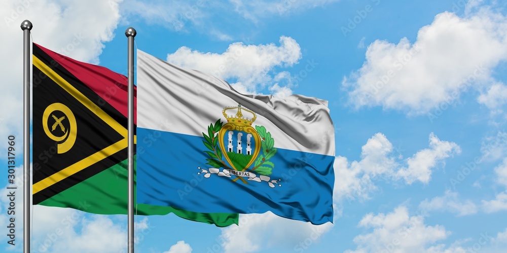 Vanuatu and San Marino flag waving in the wind against white cloudy blue sky together. Diplomacy concept, international relations.