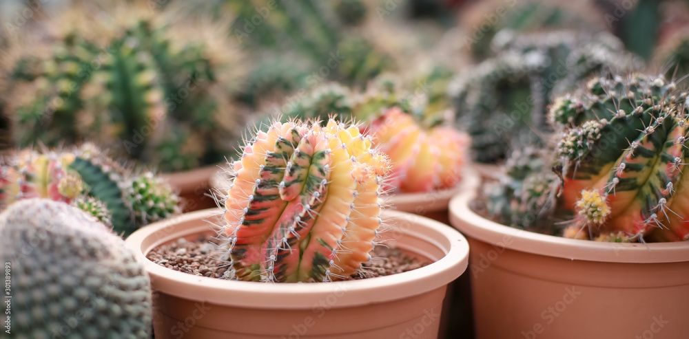 Selective focus close-up shot on cactus and colorful cactus and experience the afternoon sun. Cactus plants are planted on flower plots as a background image and used for making screen wallpapers.