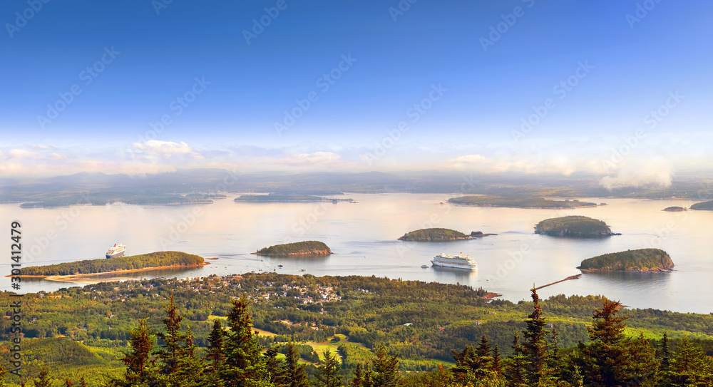 Panoramic view of Bar Harbor in the morning with cruise ships and cluster of small islands from Cadillac Mountain in Acadia National Park, Maine USA