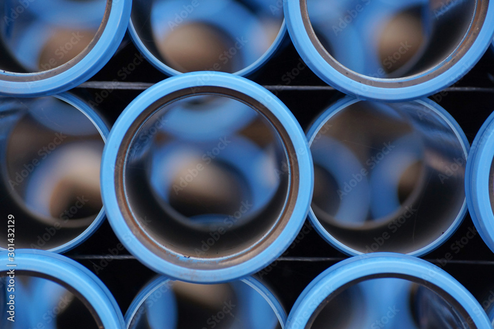 Nahaufnahme mit Bokeh von blauen Rohren auf einer Baustelle