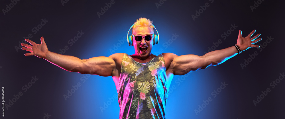 Fashion Muscular DJ man listen to music in colorful neon light with hands up. Handsome blonde Hipster guy Having Fun happy. Art neon fashionable style. Music festival nightclub, summer party concept
