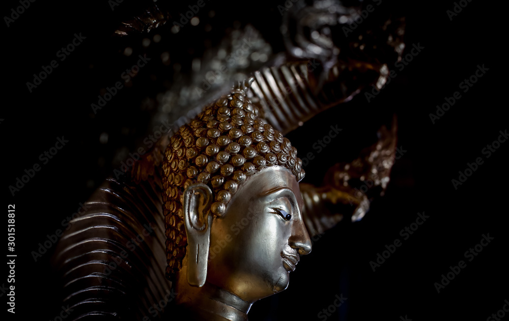Selective focus close-up shots of Buddha statues that are used as amulets of Buddhism