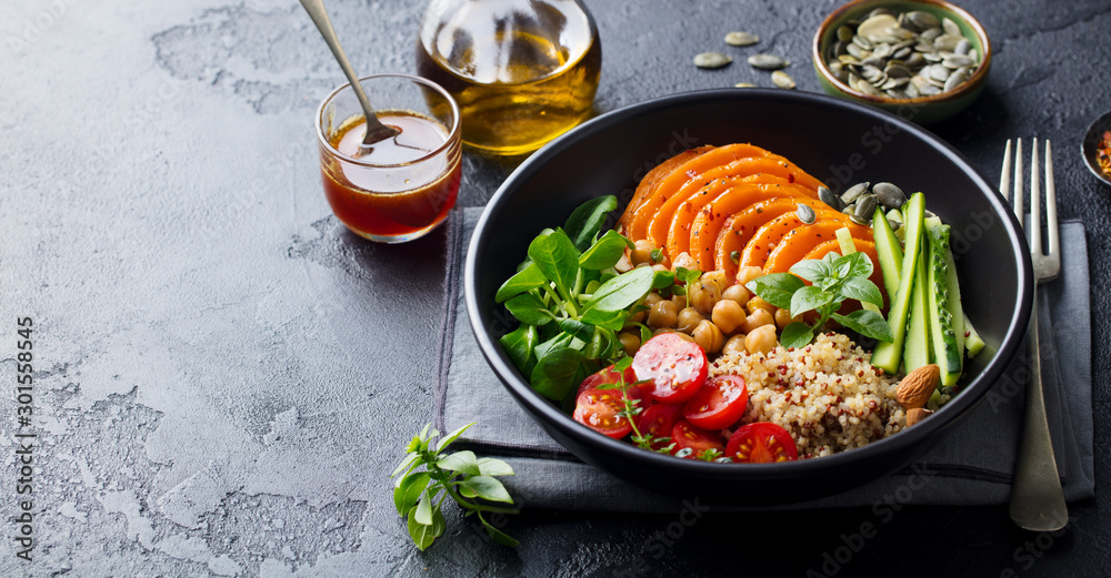 Healthy vegetarian salad. Pumpkin, quinoa, chickpea, tomatoes, green salad. Buddha bowl. Slate background. Copy space.