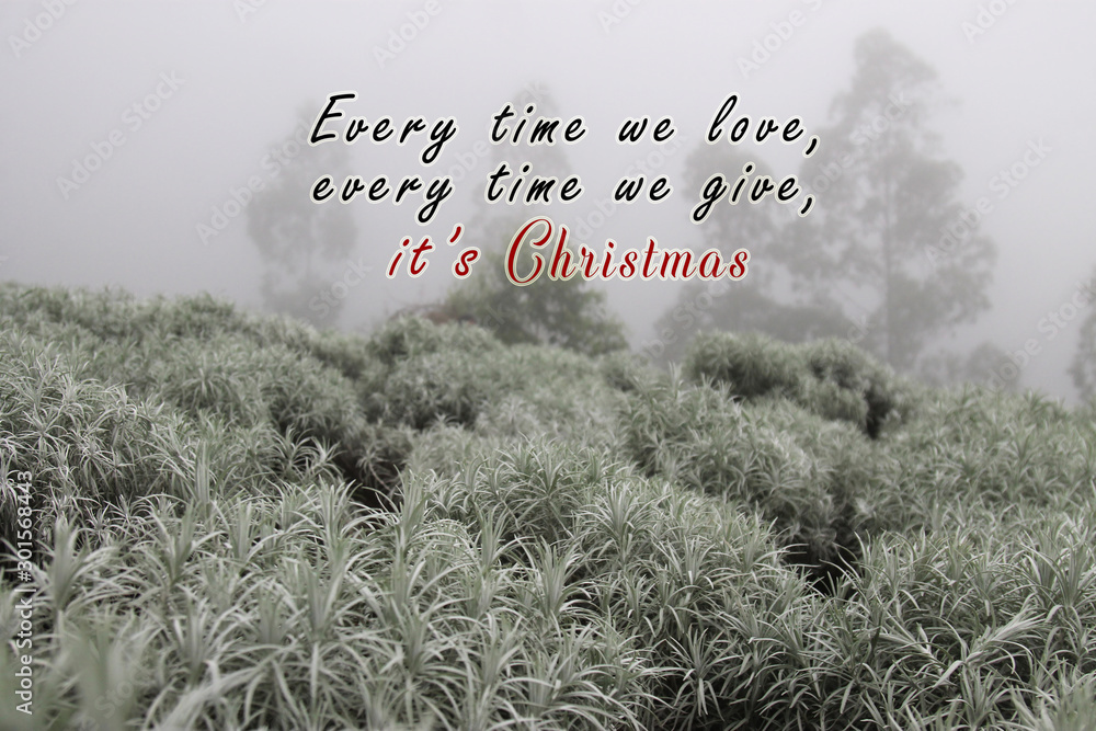 Inspirational quote - Every time we love, every time we give, It is Christmas. With white background of edelweiss garden on winter & foggy day. Holiday season & Merry Christmas concept.