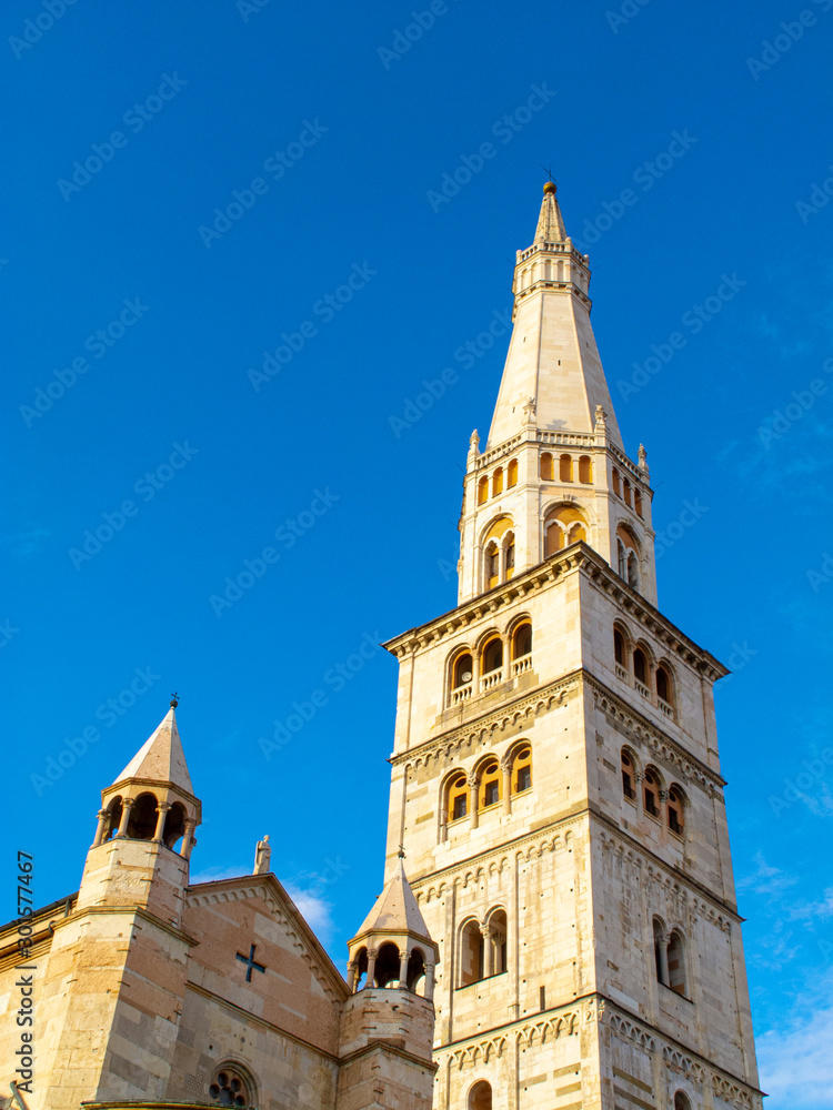 La torre campanaria di Modena, la Ghirlandina, con cielo blu sullo sfondo, Italia