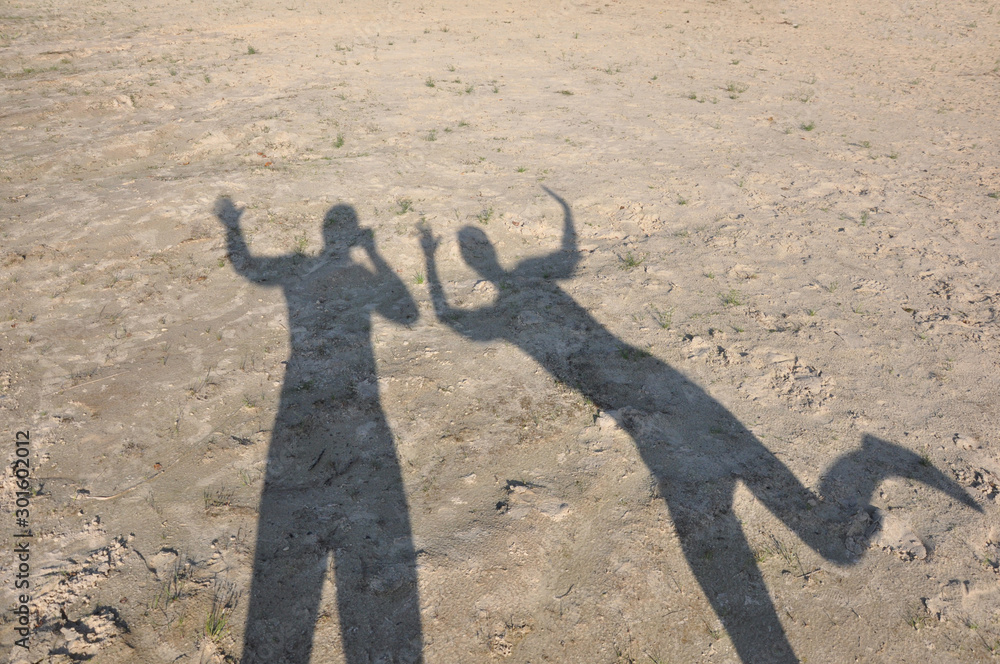 Blurred shadows of people with raised hands on the sand.