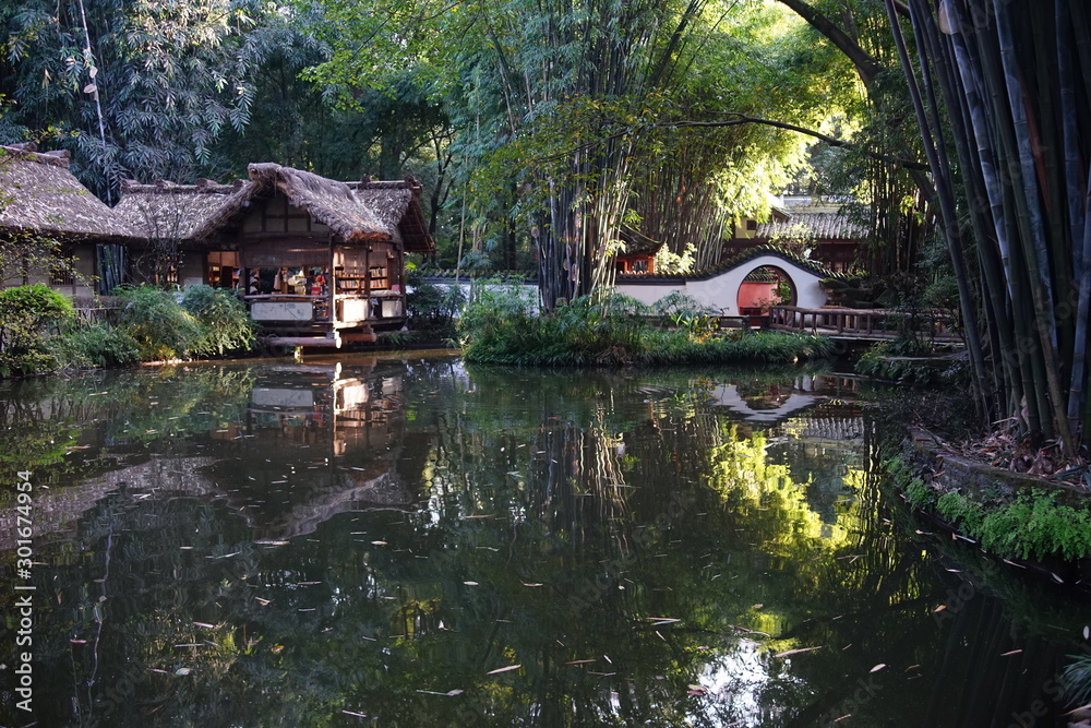 Beautiful lake with bamboo garden in Thatched Cottage of Du Fu, it was the home of a famous poet, Du Fu, in Tang Dynasty.
